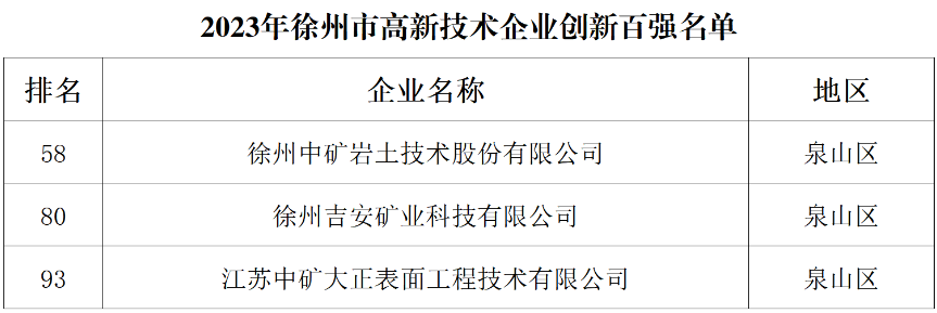 “创新百强企业”是徐州市年度最具有科技创新活力的高新技术企业代表,本次徐州中矿岩土技术股份有限公司、徐州吉安矿业科技有限公司、江苏中矿大正表面工程技术有限公司作为江苏淮海科技城企业获此殊荣。