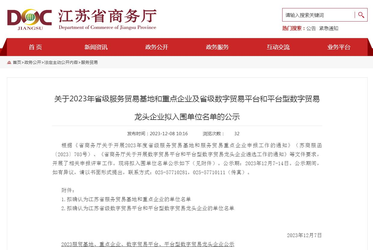 江苏省商务厅官网发布了《关于2023年省级服务贸易基地和重点企业及省级数字贸易平台和平台型数字贸易龙头企业拟入围单位名单的公示》